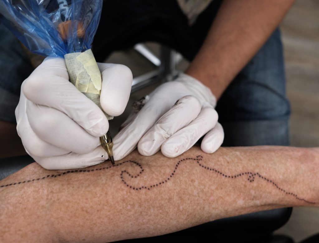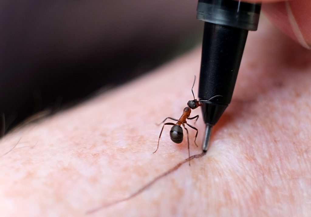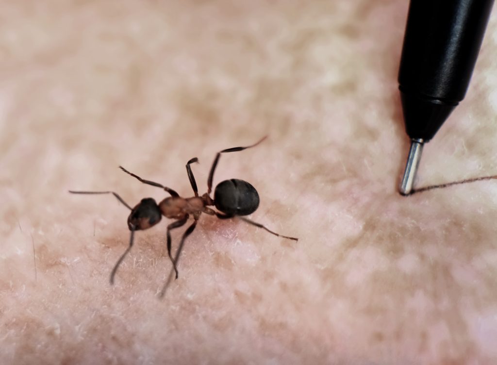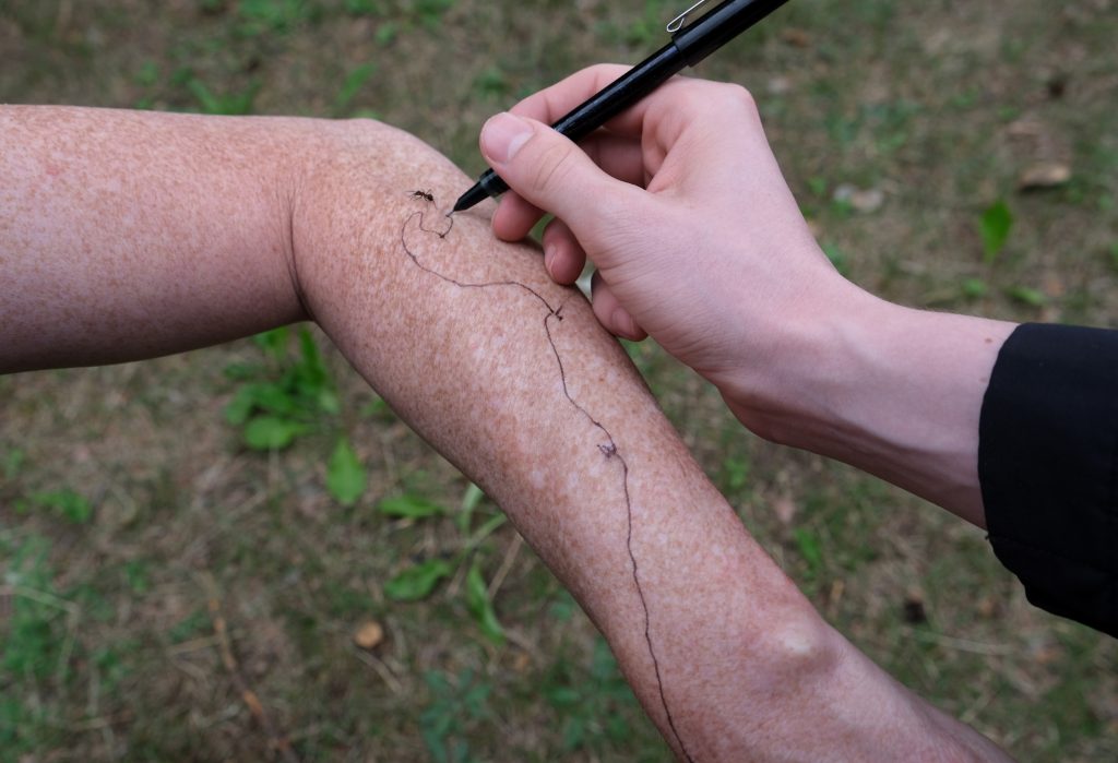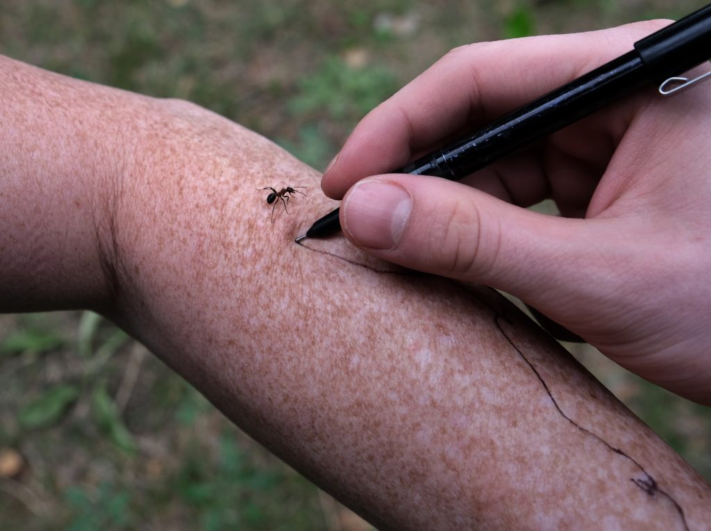 In the summer of 2021, a woodland ant is placed on a wrist and allowed to walk up the length of a freckled arm. As the ant travels, an assistant follows the creature with a felt-tip pen – tracing the meandering path onto the host’s skin with black ink. The next day in a local tattoo parlour the fading ink path becomes a permanent tattoo – a record of a brief encounter and a small journey.