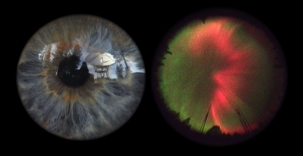 The ‘failed’ journey resulted in a two-screen film. The first screen shows a circular-shaped film made entirely from the reflection as seen in the artist’s iris. Seen obliquely through the wobbling, liquid reflection of a waiting eye – the footage documents the strange location and the machines that the scientists used to successfully observe the Aurora Borealis or Northern Lights hiding behind the clouds. The second screen shows footage of a dramatic Aurora storm – as seen by the aurora observatories ‘All-Sky-Camera’.