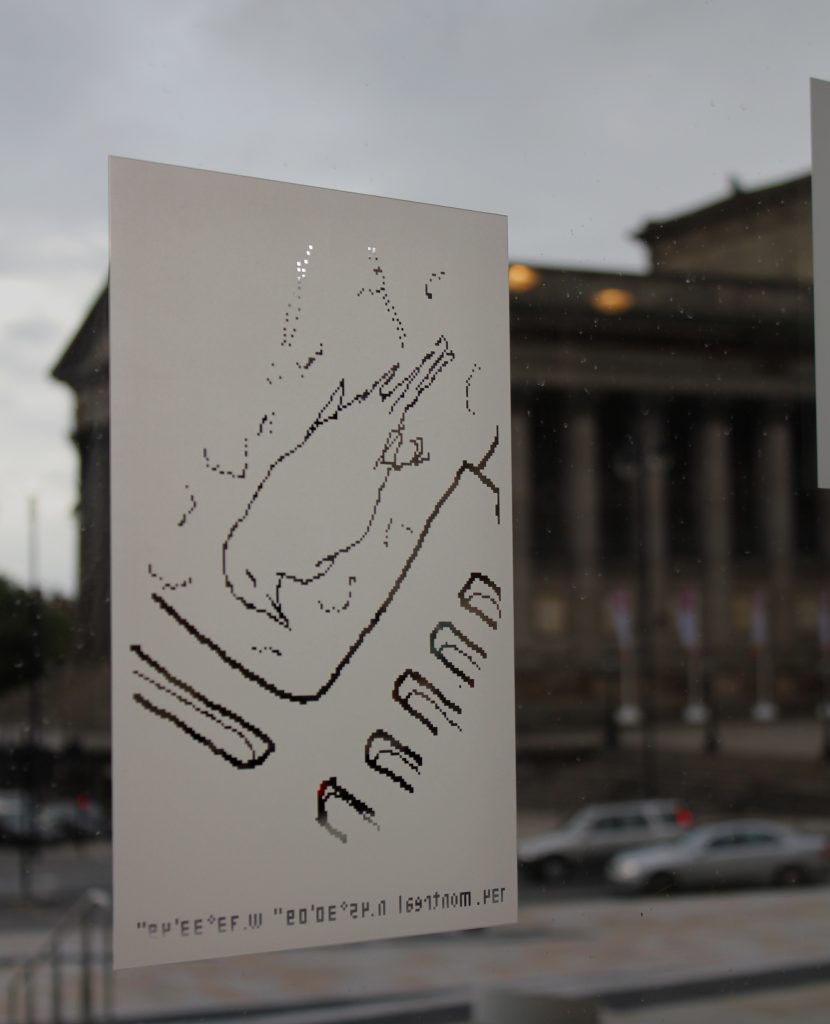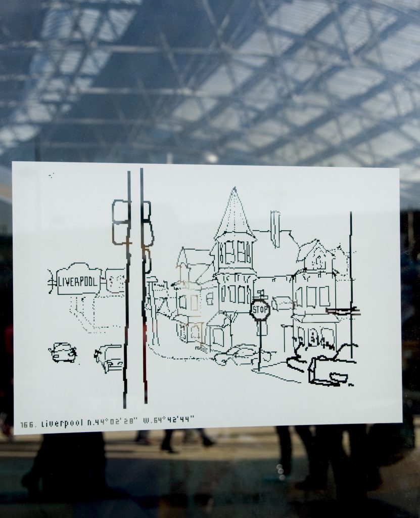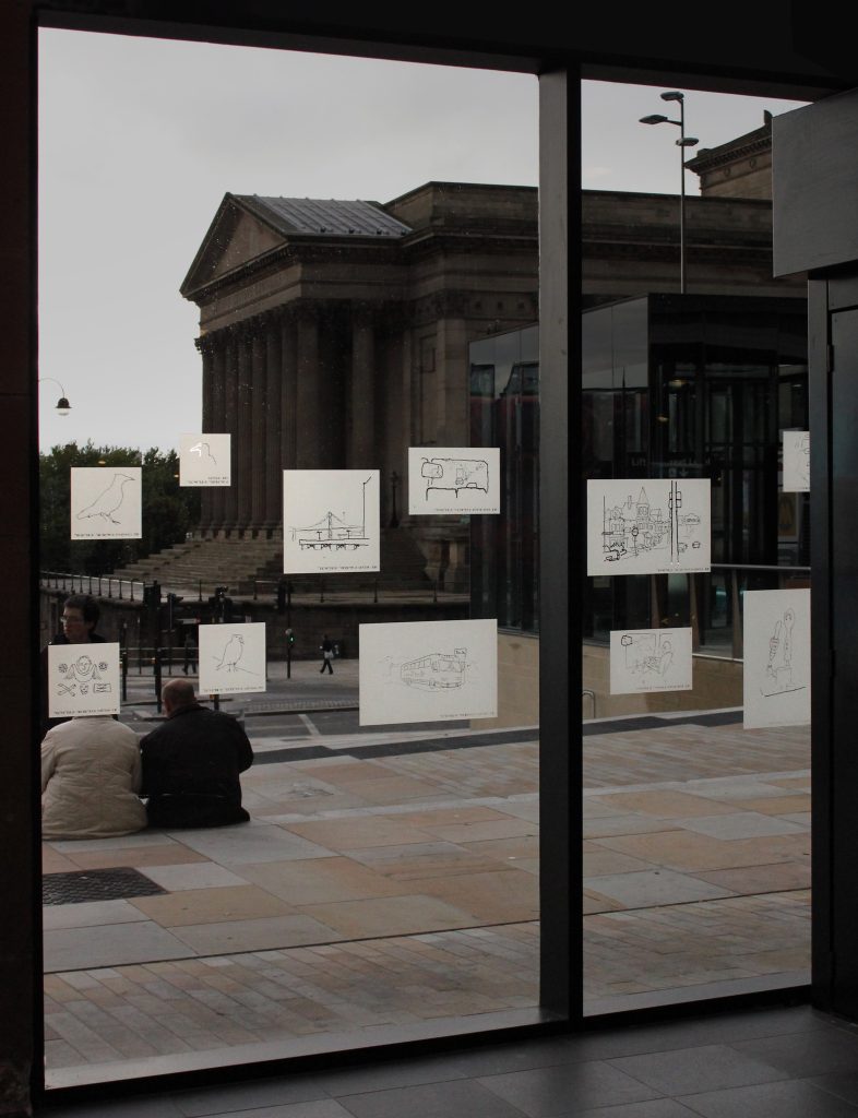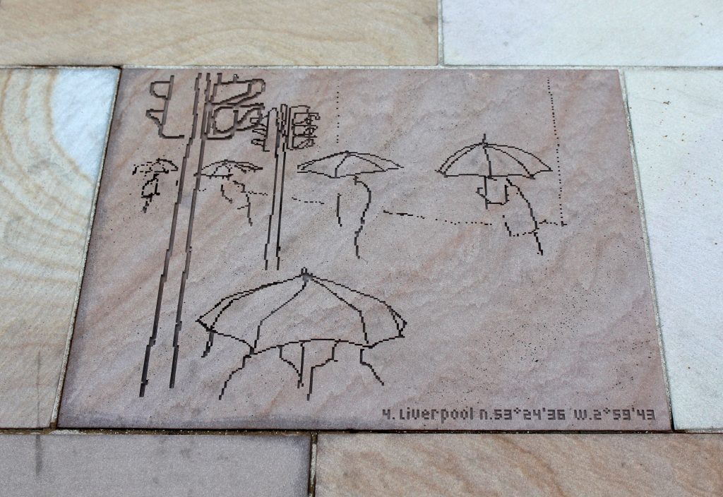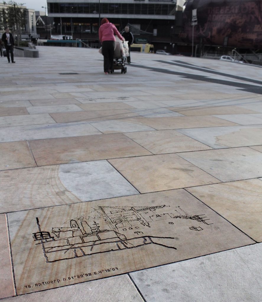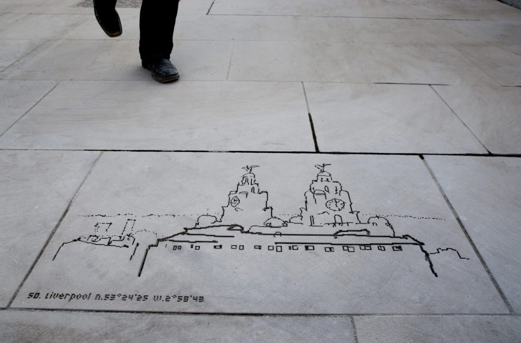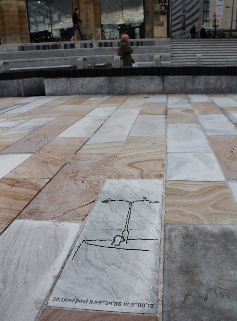 A permanent artwork for the city of Liverpool, England. 181 drawings were made on a month’s journey from Liverpool (UK) to another Liverpool on the coast of Nova Scotia, in Canada. Traveling by container-ship across the Atlantic, and then by train and bus, the goal was to trace some of the trade routes that created this city of empire. All 181 drawings made on the journey were then sandblasted into the York paving-stones and plate-glassĀ of a new public space at the heart of Liverpool, England. As well as this permanent installation, the drawings and writing from this journey are also collected into a book published by Liverpool University Press.