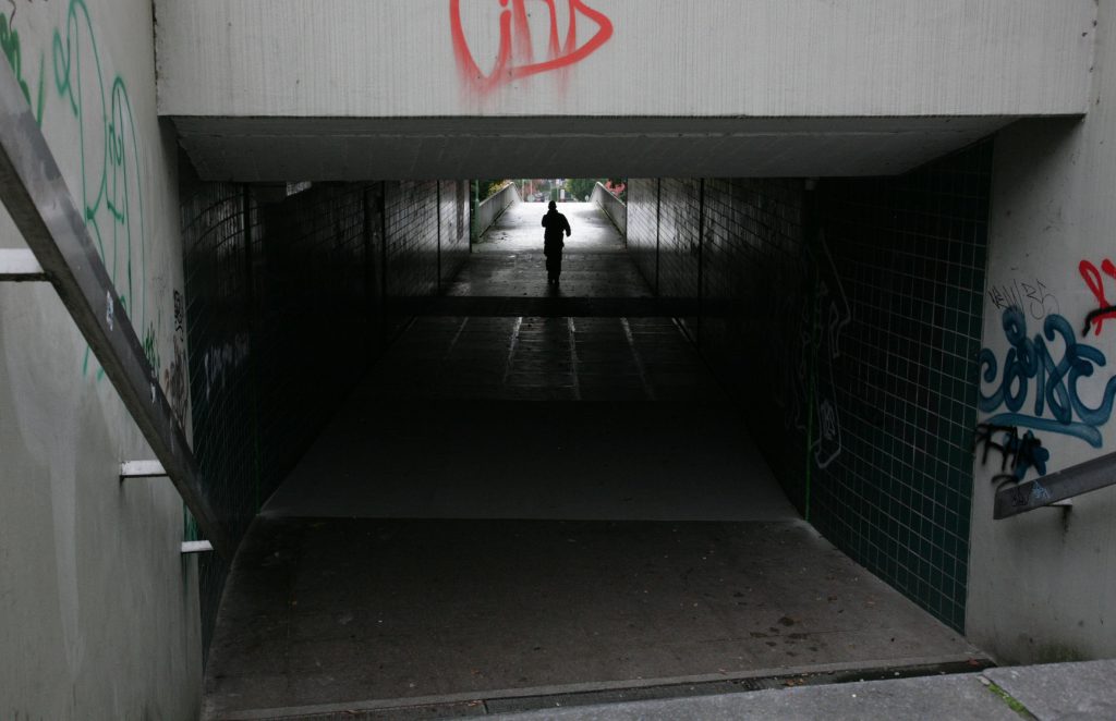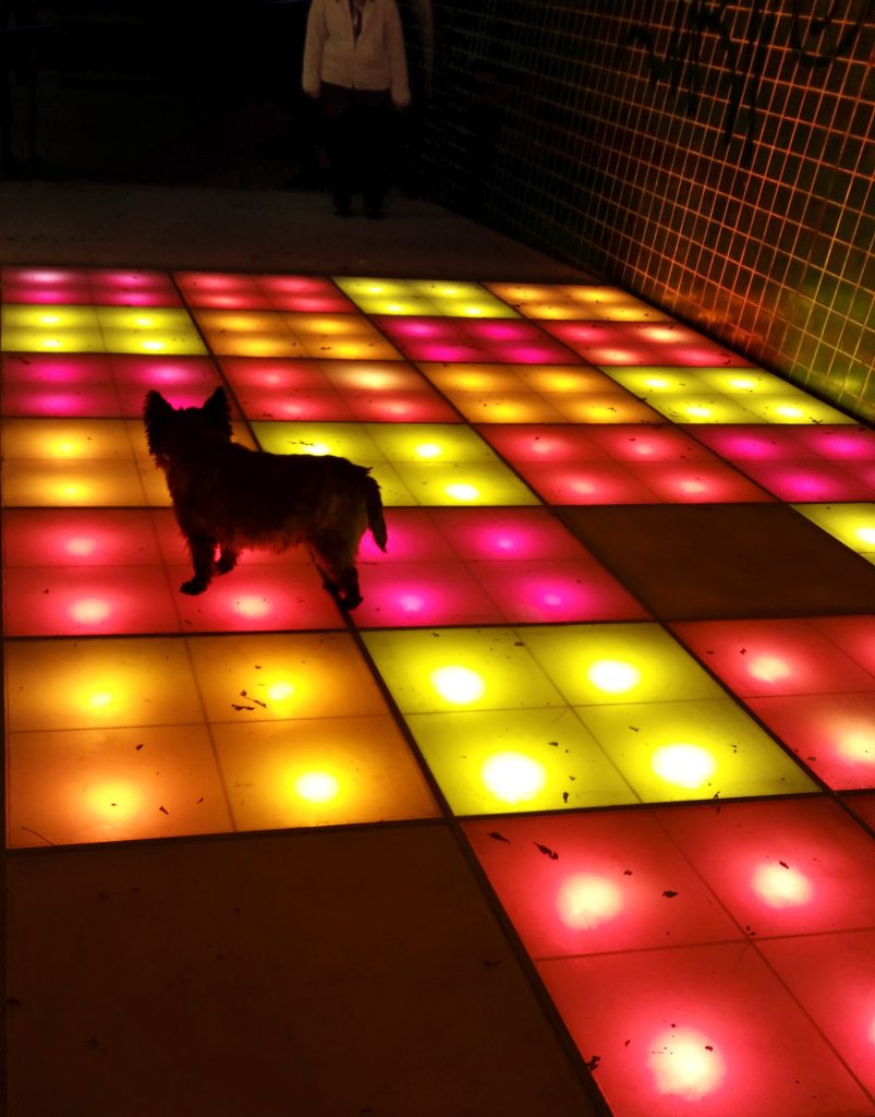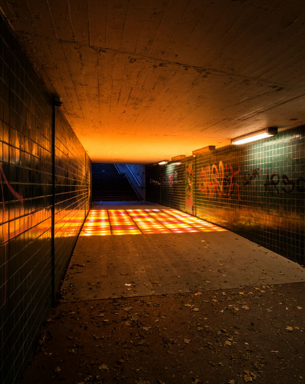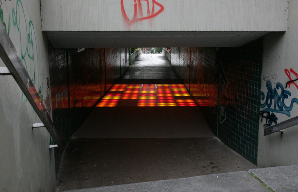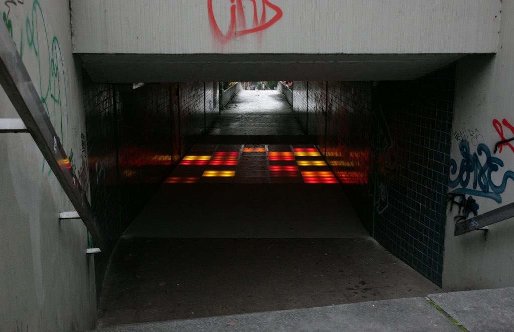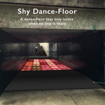 In the shadows of a pedestrian under-pass, the approaching viewer sees a set of under-floor lights twinkling in the darkness. As they draw nearer, the viewer discovers a 70’s under-lit dance-floor pulsing silently to an unheard rhythm. As the viewer nears the apparition though, the lights vanish. All that is left behind is a drab, tiled walkway and an inert floor. If the viewer stays very still though, the apparition returns – bathing them in a warm pulsating glow from bygone era. However, if the viewer attempts to dance (or makes just the slightest of moves), the pulsing dance-floor once more vanishes.
