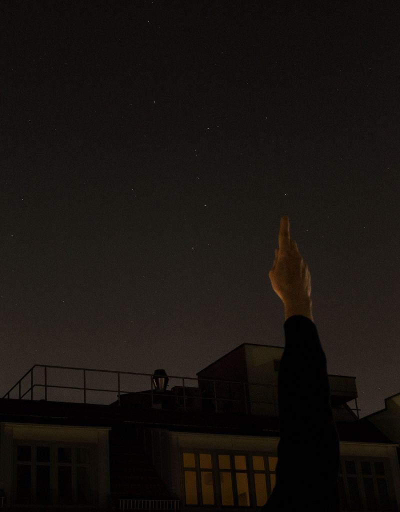 Light from the star: ‘Beta Cassiopeiae’ takes 54.5 years to reach the Earth. In March 2021, a photograph records photons from Beta Cassiopeiae meeting a hand that is also 54 and a half years old. Two entities, born at the same moment, meet each other on a balcony in Berlin – having both travelled through space and time for exactly 54.5 years.